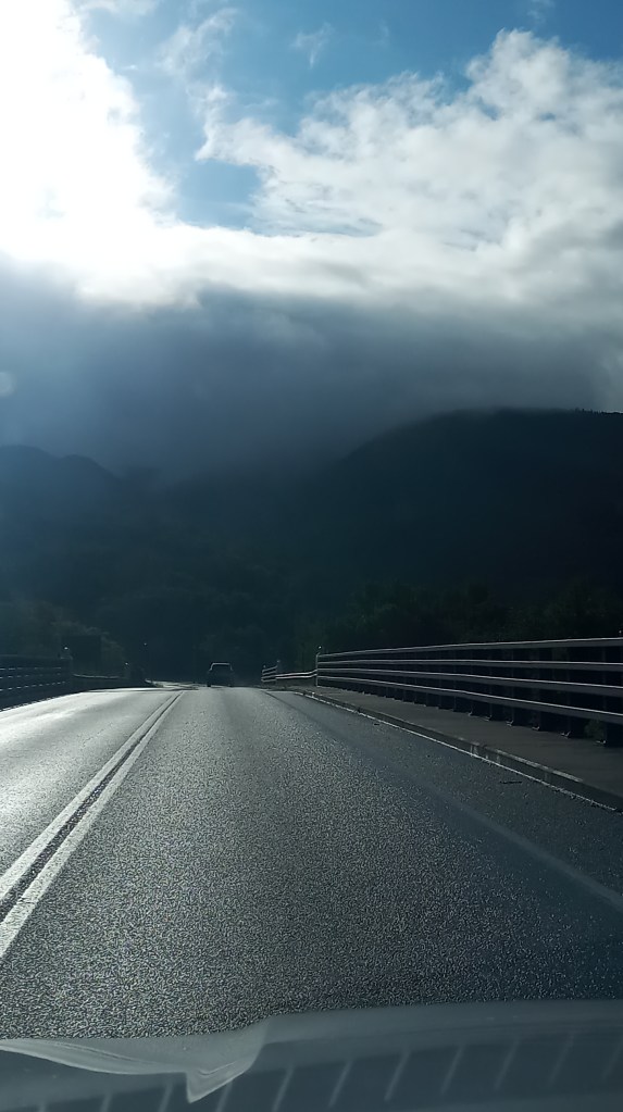 The plan was to stop at Riviere-du-loup, but just before reaching we thought we keep going because we filled gas just before (had to readjust the little ones pillow since she fell asleep), and since our little girl was asleep we thought we take advantage and keep going. Plus we were still full from the breakfast. Just before reaching Riviere-du-loup she woke up but we decided to keep going anyway. It was some beautiful scenery despite the long journey.