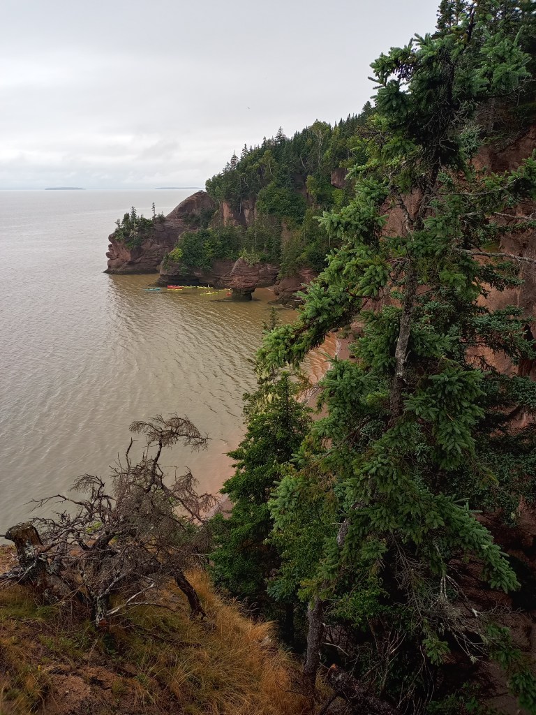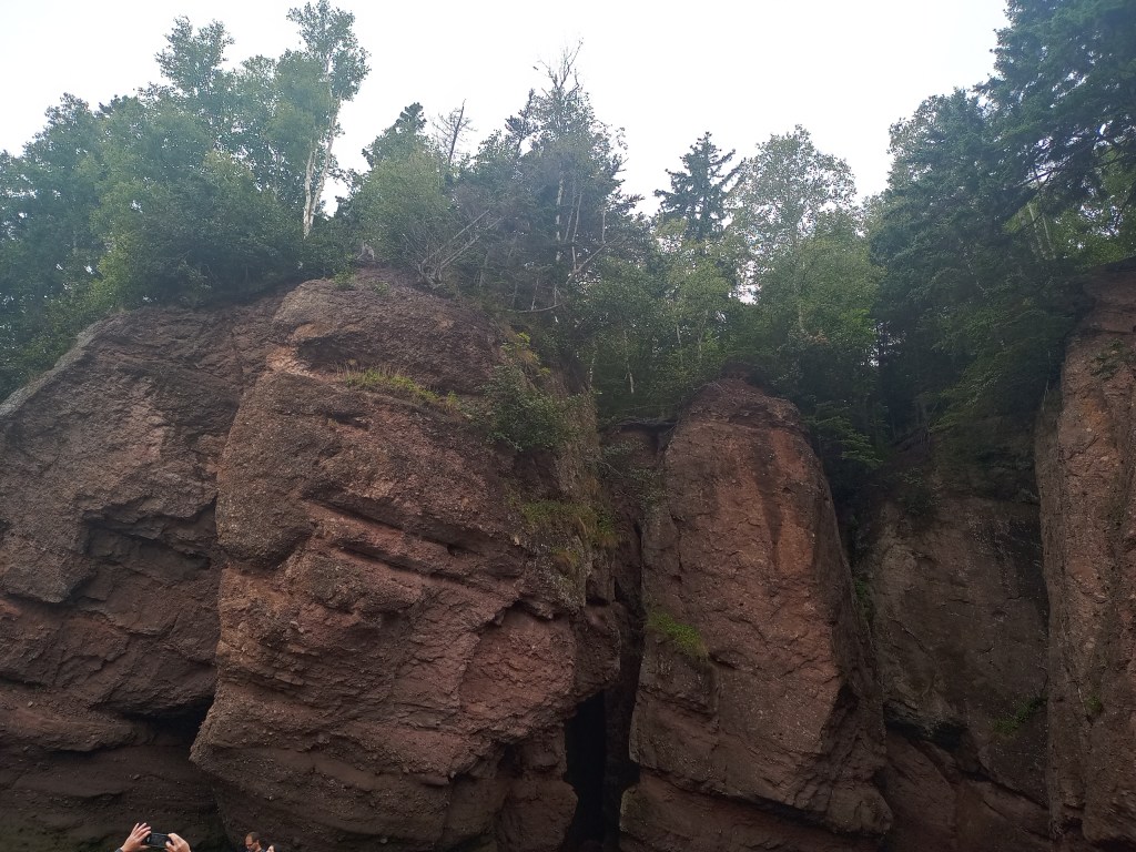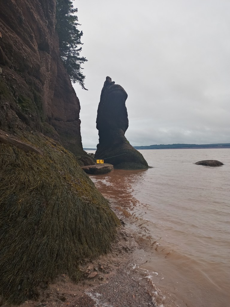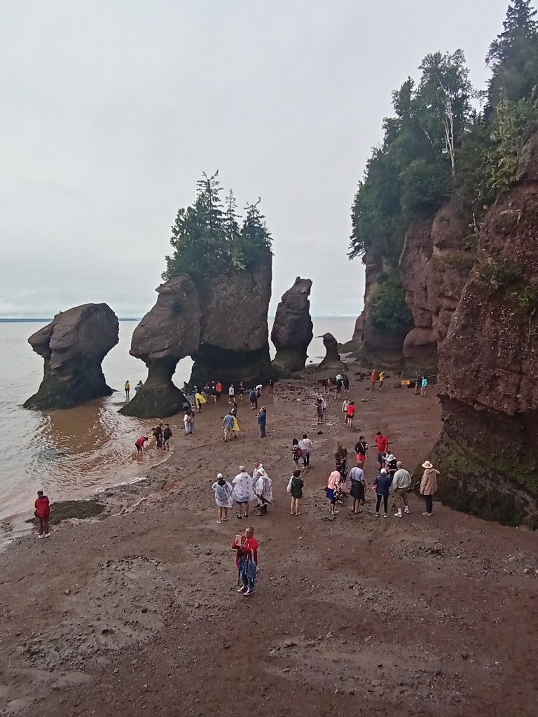 The rest of the day it was pretty much driving through the rainy highway to Hopewell Rocks in New Brunswick. We got to the centre and walk through the area to see the Diamond and Flower pot rocks from up above. Then my son and I walked down to the famous ocean floor while the tide was relatively low, it was in between because we did see some kayakers nearby. After a shuttle bus back – mainly to impress our 3 year old who wanted to ride a “bus” we had lunch in the restaurant there. I have to say the walk through the park, although wet, was easy and stroller friendly. The lunch was ok and as expected overpriced. Had the lobster poutine and kids had the usual mac and cheese – at this point they have to be nutrient deficient from all the fires and mac and cheese lunches. My son gave me a small scare by leaving the washroom without me noticing and I was waiting for him still thinking he was still in there – but after a telling off we moved on, as usual.